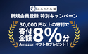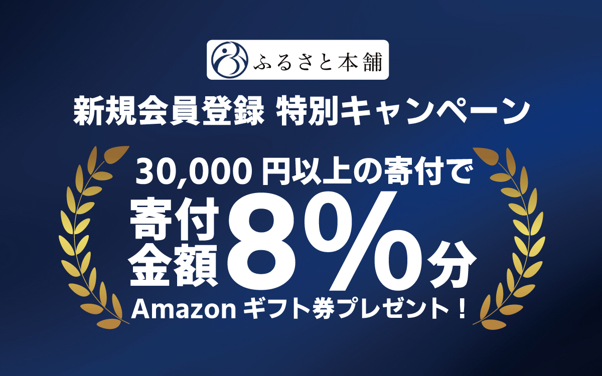 ・内容:期間中「ふるさと本舗」に新規会員登録を完了し、キャンペーンコード【2020NEW】を用いて合計3万円以上の寄付申し込みをした方を対象に、寄付金額の8%分のAmazonギフト券をプレゼントいたします。