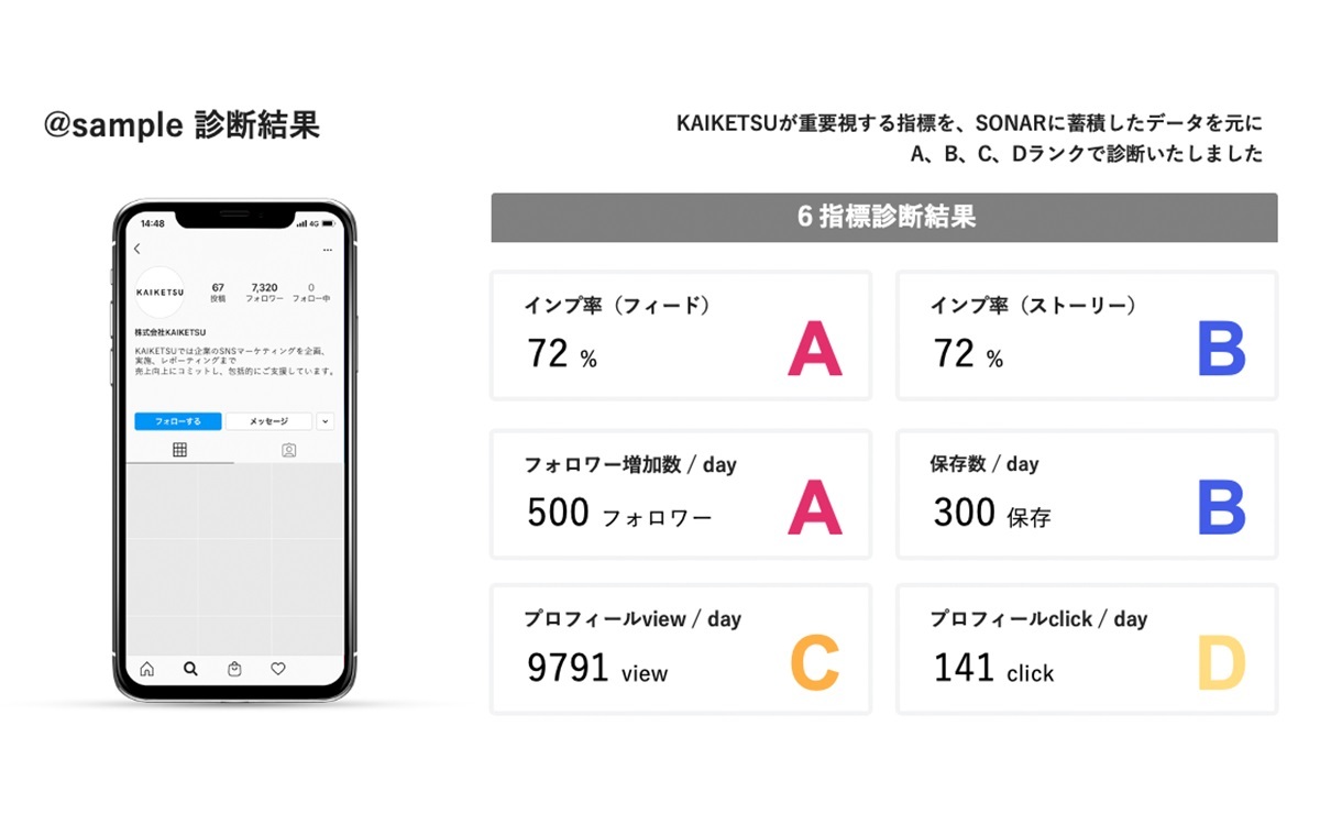 Instagramのアカウントを、重要な6つの指標別に、A~Dの4段階で瞬時に診断します。アカウントを診断することで、アカウントの伸びている部分や伸び代がある部分などが可視化され、より最適な運用PDCAを回すことが可能です。