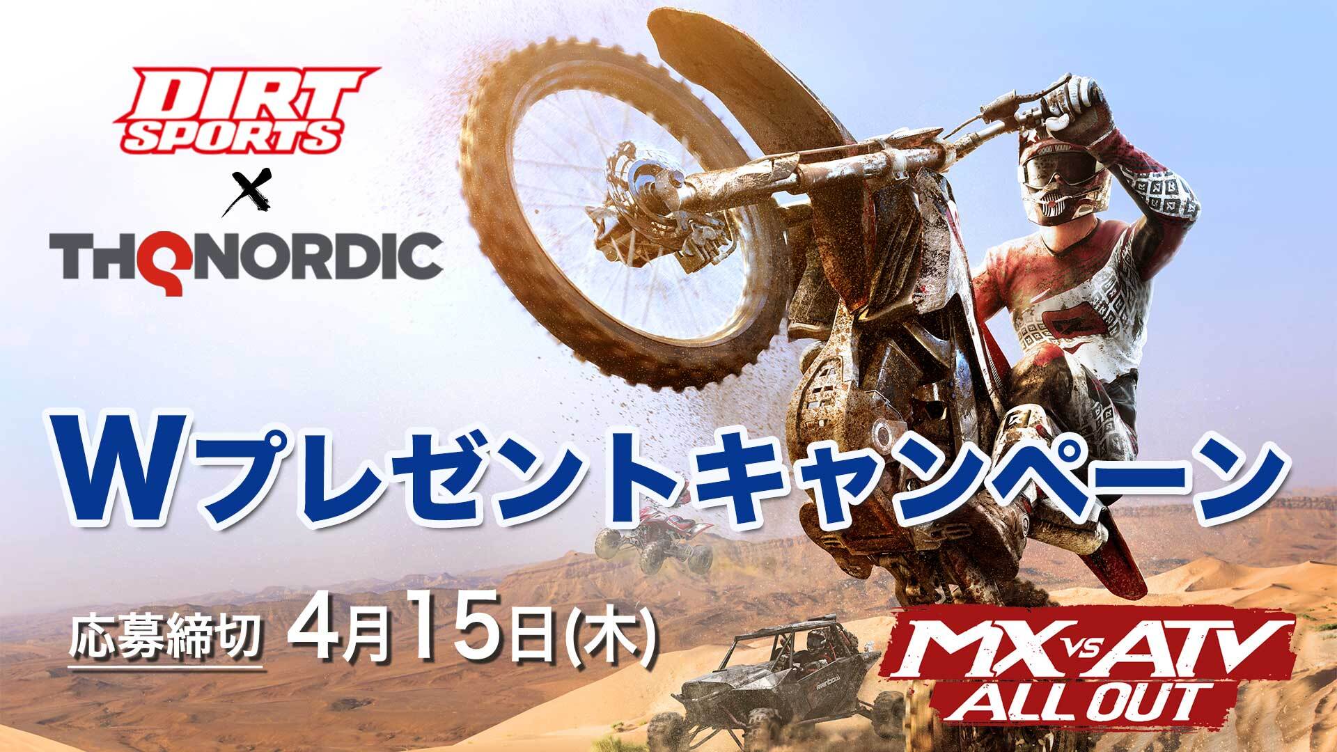 THQ Nordic Japan株式会社は、オープンワールド・オフロードレースゲーム『MX vs ATV All Out』をNintendo Switch™、PlayStation®4にて4月8日(木)に発売することを記念して、ダートスポーツとコラボレーションプレゼントキャンペーンを実施いたします。