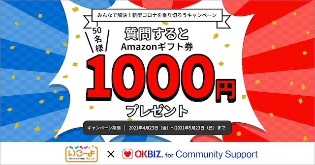 実施内容: 『OKBIZ. for Community Support』の「テーマ:みんなで解決!新型コロナ」( (リンク ») )にて期間中にコロナ関連の質問投稿を行ったユーザーを対象に、抽選で50名にAmazonギフト券1,000円分をプレゼント。