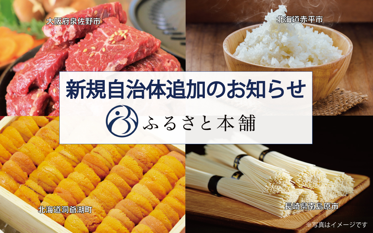特産品ポータルサイト「ふるさと本舗」、大阪府泉佐野市、北海道赤平市、北海道洞爺湖町、長崎県南島原市の情報を追加