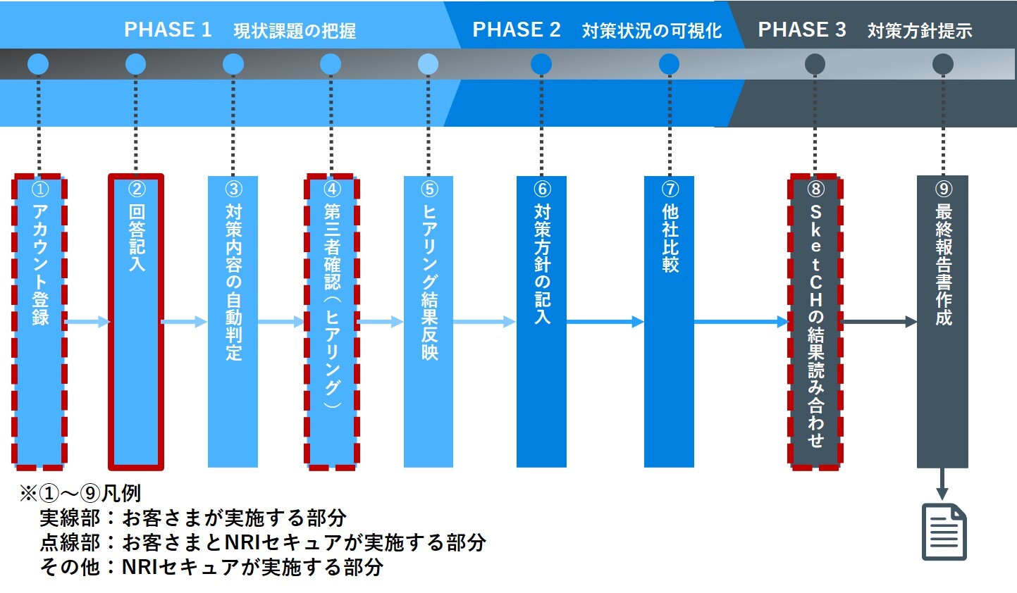 本サービスは、9つのステップで実施します(図を参照)。おもな流れとして、企業の情報セキュリティ担当者がSecure SketCHでアカウントを登録し設問に回答すると、NRIセキュアのコンサルタントが、選択された回答基準が実態に即しているかどうかをヒアリングして確認します(回答基準の例は「ご参考」を参照)。その後、Secure SketCHが自動で推奨する対策案にもとづき、優先度や具体的な進め方をコンサルタントが提案し、各社にとって最適な対策方針を利用企業とともに決定していきます。決定した方針をSecure SketCHに登録し、今後の状況確認に活用するほか、Secure SketCHによる評価結果とは別に、第三者による評価の結果としてコンサルタントが最終報告書を作成し、提供します。