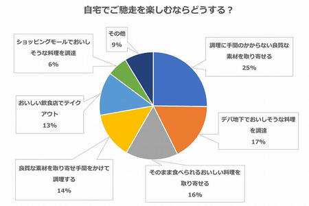 また、自分で買いに行く調達方法では、全体では2位の「デパ地下でおいしそうな料理を調達」が17%で最多、「おいしい飲食店でテイクアウト」が13%、「ショッピングモールでおいしそうな料理を調達」が6%という順でした。コロナ禍でテイクアウトサービスをする店が増えましたが、ご馳走を調達する場として認知されていることがわかります。