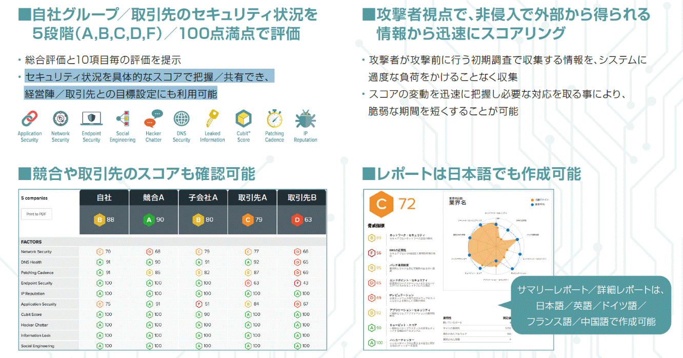 自社やグループ企業/取引先のセキュリティの対策状況を診断結果からスコアリングすることによりセキュリティ専門化ではない経営者に対して自社/取引先のセキュリティリスクをわかりやすくレポート可能。