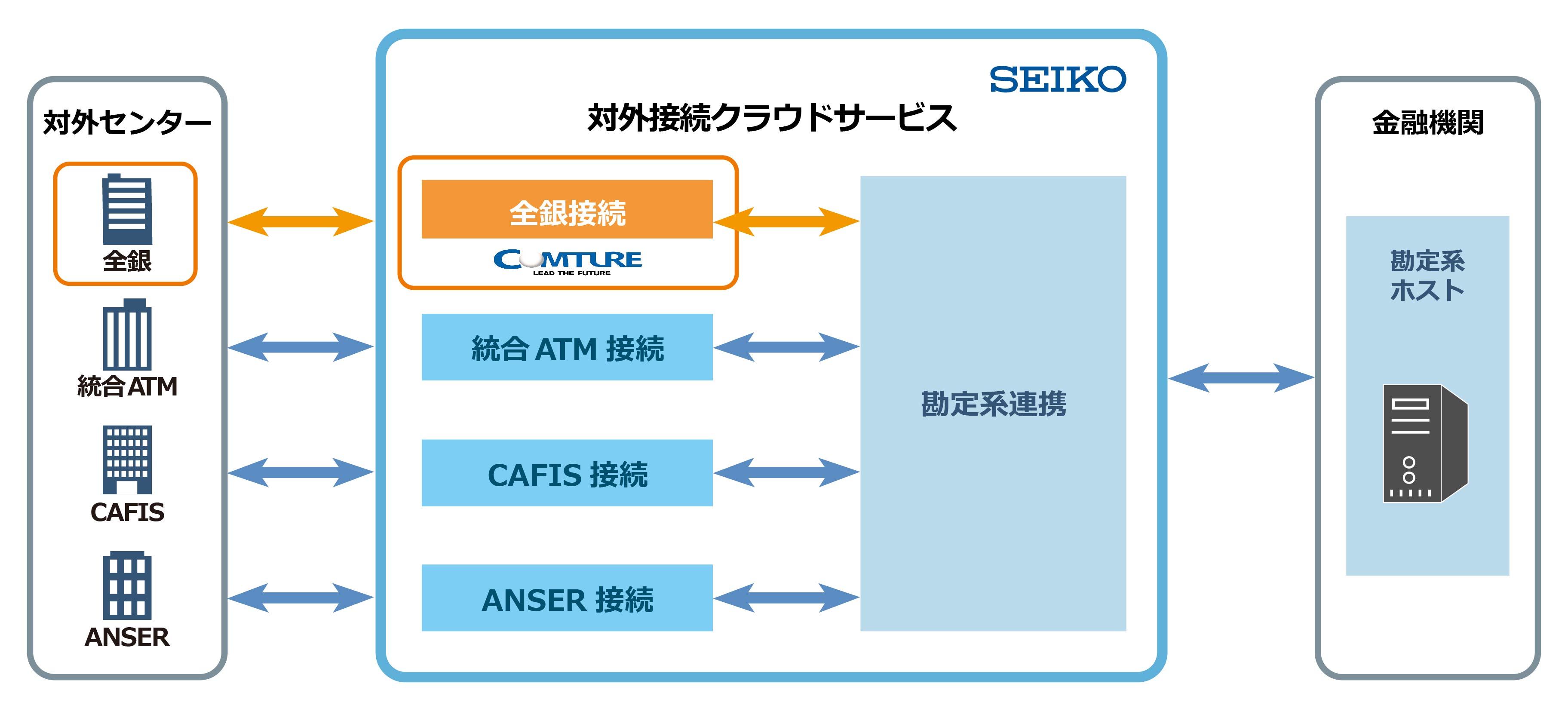 セイコーソリューションズは、金融機関向けソフトウエアパッケージを軸に、複数の国内銀行、外資系銀行、保険会社、資金移動業者へCAFIS、ANSER、統合ATM接続をはじめとする各種対外センターとの接続システムを提供してきました。