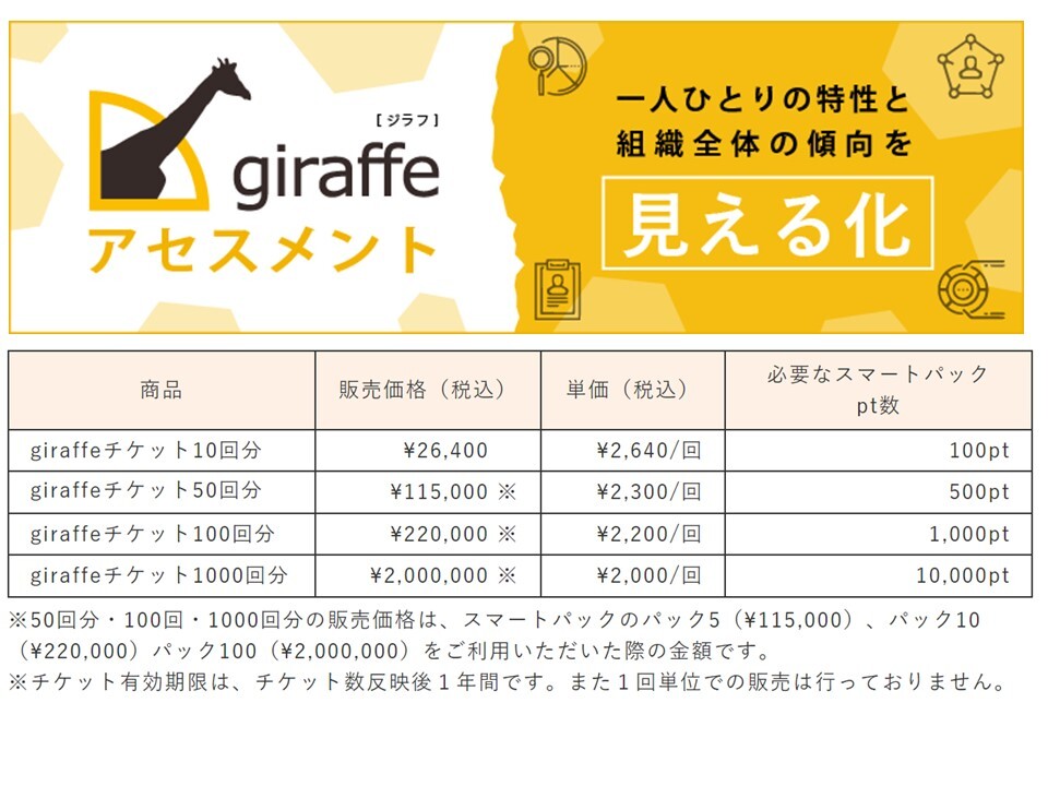giraffeチケットのご購入にあたっては、人財育成スマートパック(以下、スマートパック)もご利用いただくことができ、購入ポイント数に応じて最大50%の値引き率が適用されます。