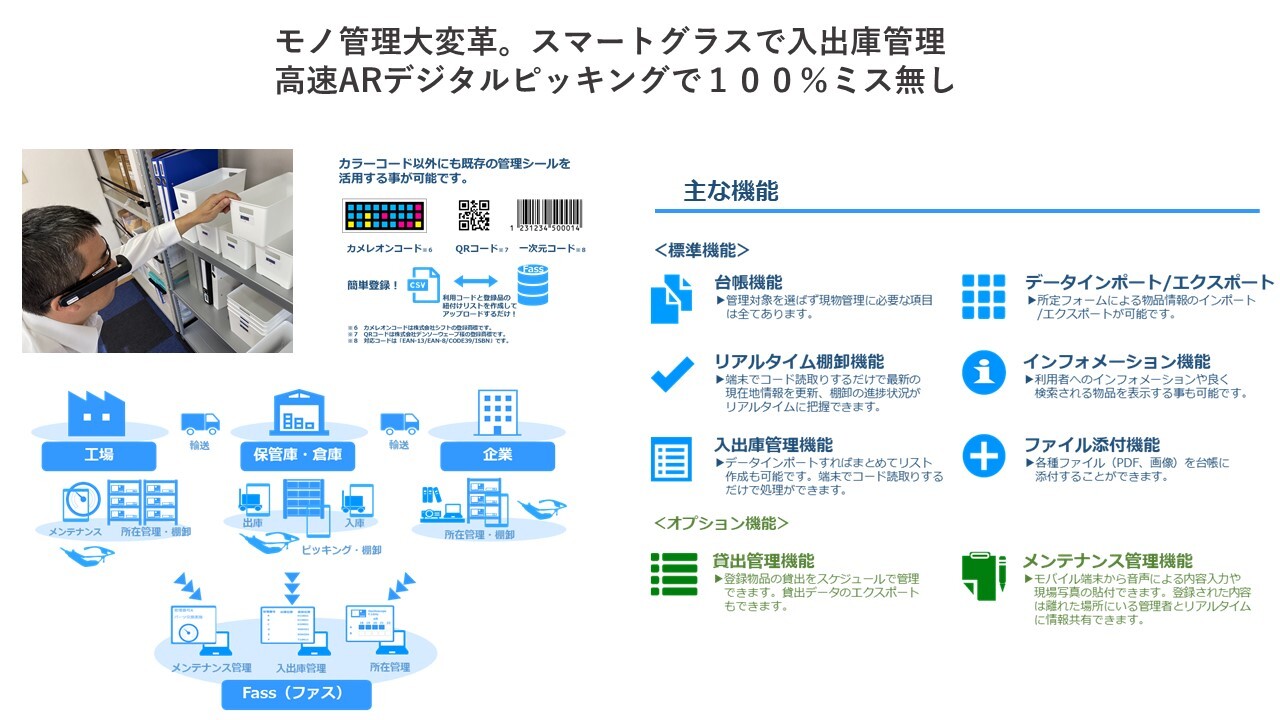 多種多様な製品の入出庫作業をマートグラス「Fun to Find for SG」+入出庫管理システム「Fass」と連携する事で、