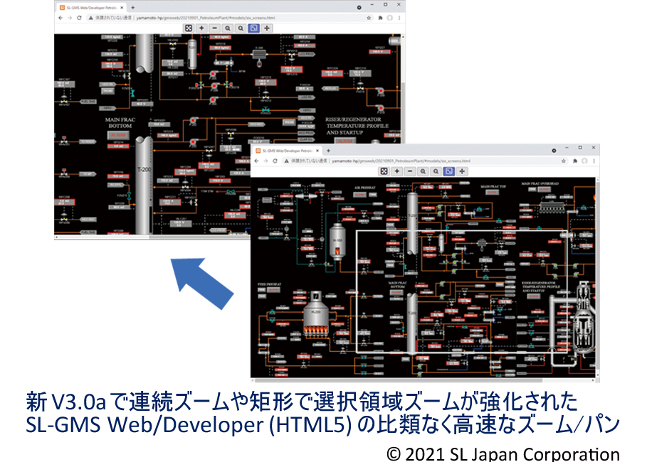 HTML5 版の SL-GMS Web/Developer は、従来の SL-GMS 製品 (C++, Java, .NET 版) と共通の SL-GMSDraw エディタで作成した監視制御システムのグラフィック操作画面を、コードジェネレータを使って比類なくコンパクトで高速な HTML5 コードに変換し、Web 運用することを可能にした新製品です。これにより、制御室と同じコンテンツリッチで高対話性のグラフィック監視画面を Web ブラウザでクラウド運用でき、ローカル運用と同等の高い性能で、異種 OS パソコンの他、スマートフォンやタブレットなど幅広い端末からアクセスして操作できます。