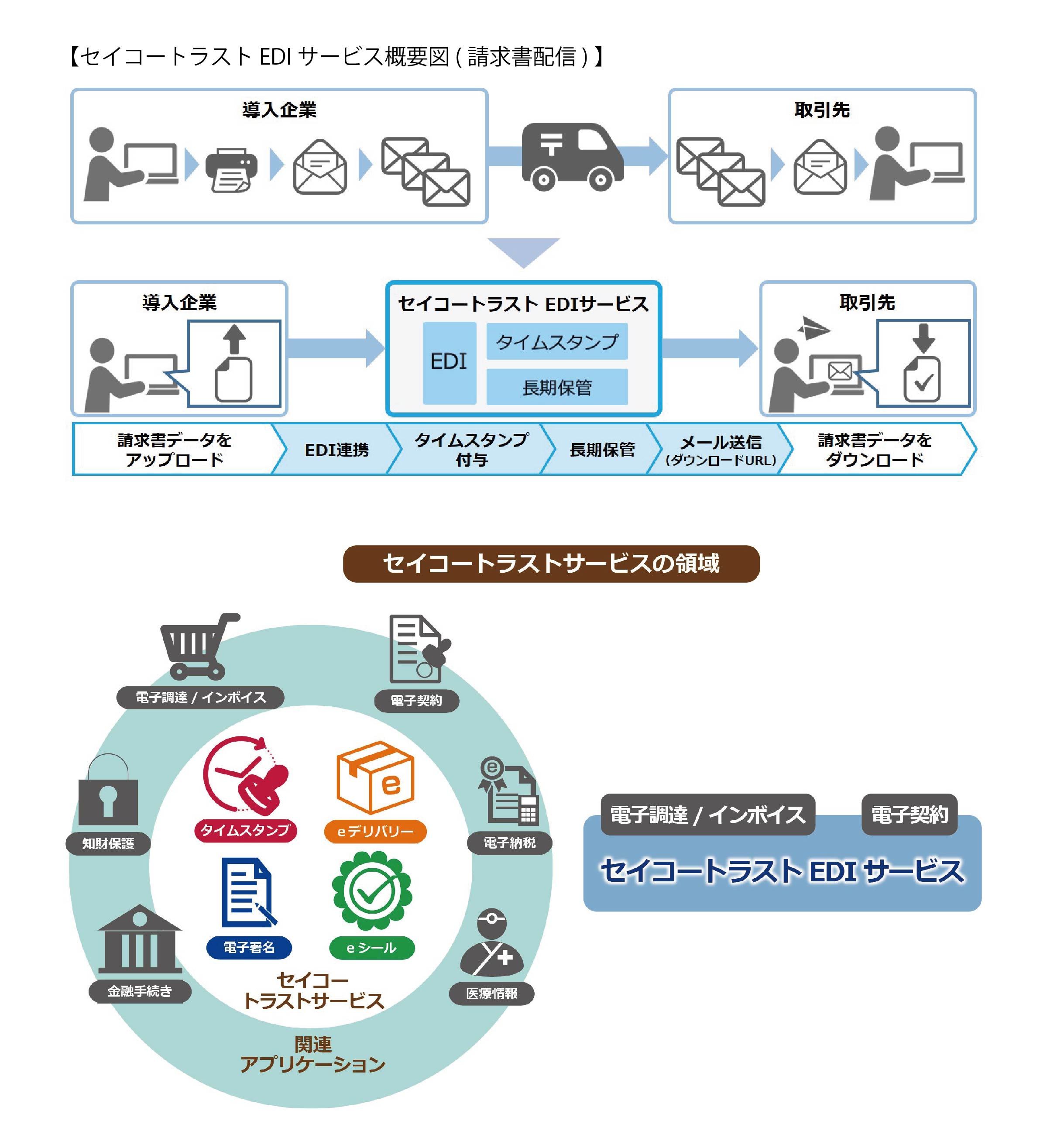 今回提供を開始する「セイコートラストEDIサービス」では、タイムスタンプを利用した電子契約・帳票配信サービスとクラウド型EDIサービスを連携させることで、基幹受発注システムとクラウドサービスのシームレスな連携を実現します。従来郵送、FAXなどで行っていた請求業務を、基幹システムの改変をせずに電子配信・電子契約に切り替えることも可能となります。
