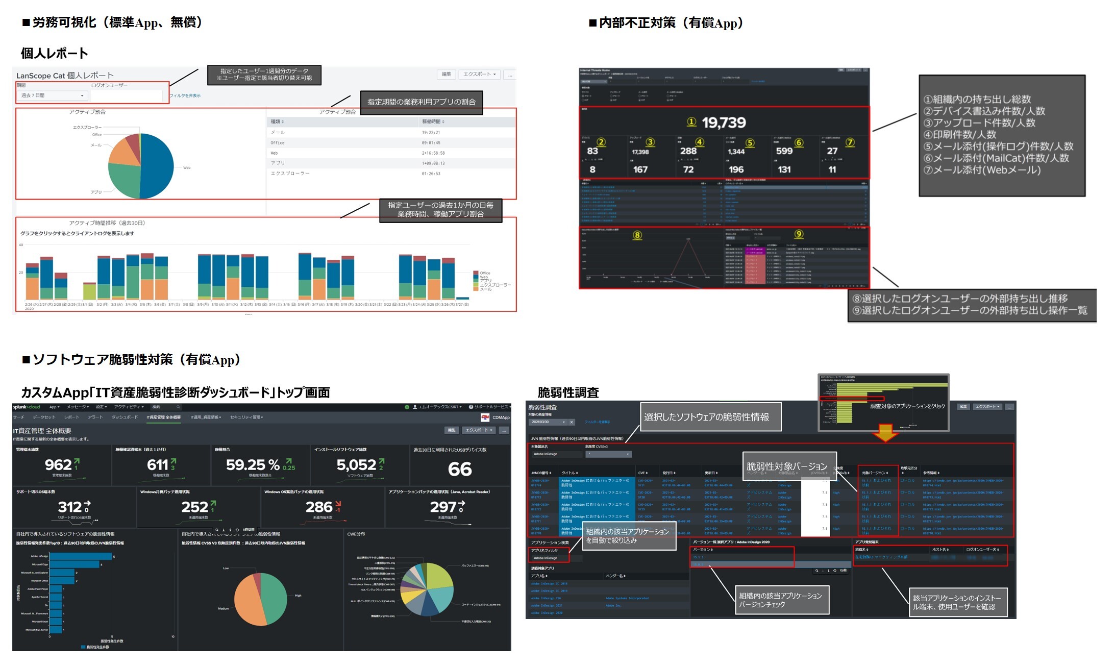 この度マクニカがエムオーテックス社と共同開発した「Splunk × LANSCOPE Original App」は、エンドポイントセキュリティを提供するエムオーテックス社のLANSCOPEと、マシンデータを元にセキュリティインシデントの検知・調査・分析を実現するSplunkを組み合わせ、LANSCOPEから吐き出される各種PC操作ログをSplunkにてダッシュボード化することで、労務可視化、内部不正対策、ソフトウェア脆弱性対策を実現します。
