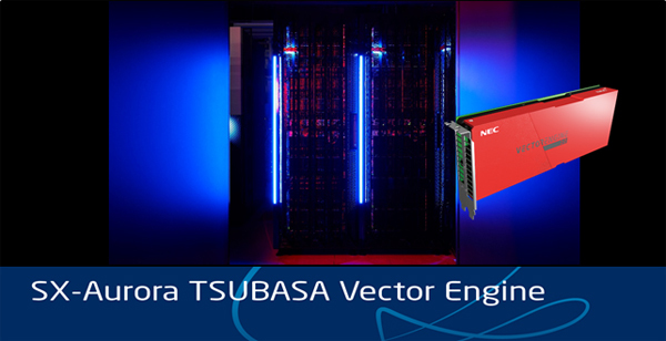 「SX-Aurora TSUBASA」は、NECが長年スーパーコンピュータ開発で培ったLSI技術と高密度実装技術、高効率冷却技術などを結集したカード型のベクトルエンジン(VE)を多数搭載する省電力なサーバです。世界トップクラスの単一コア性能及び単一コアメモリ帯域を持ち、科学技術計算や大規模データの高速処理を得意とし、気象予報、地球環境変動解析、流体解析、ナノテクノロジーや新規素材開発などのシミュレーション、AI活用において高い実効性能を実現しており、大量のデータ解析や人工知能(AI)の開発、流通業の需要予測やセキュリティ分野など、中小規模のR&Dにおけるエッジ領域で新たなビジネス創出をサポートします。