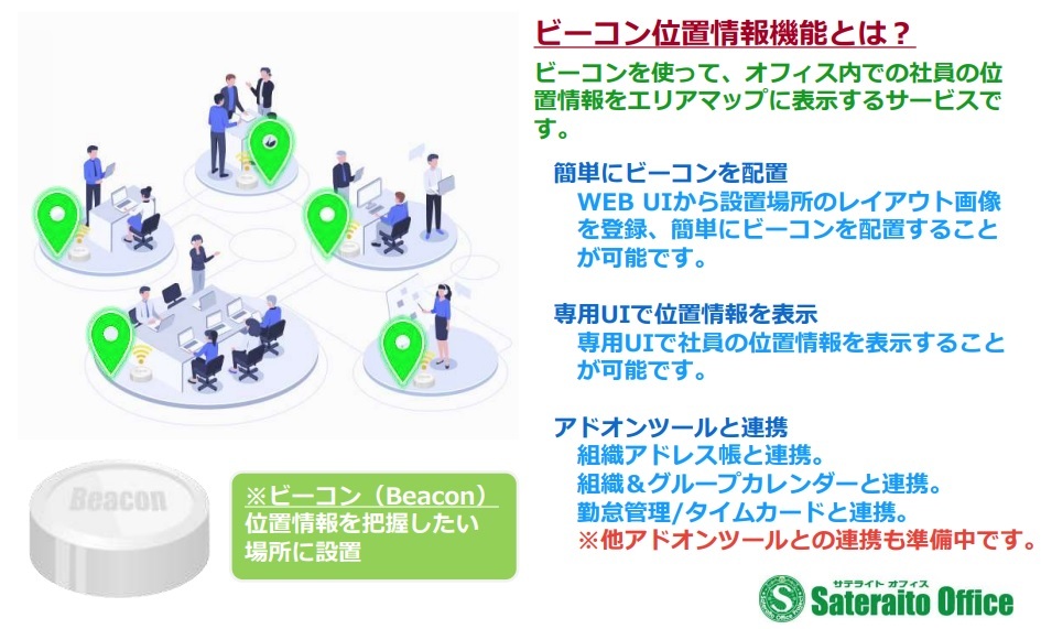 サテライトオフィス・ビーコン位置情報機能は、ビーコンを使って社員のオフィス内の位置情報をエリアマップに表示するサービスです。今回、当社のアドオンツール「組織アドレス帳/組織カレンダー」(Google Workspace、Microsoft 365)との連携機能を開発し、提供開始しました。組織アドレス帳と組織カレンダーから、社員の位置情報を確認することが可能になります。