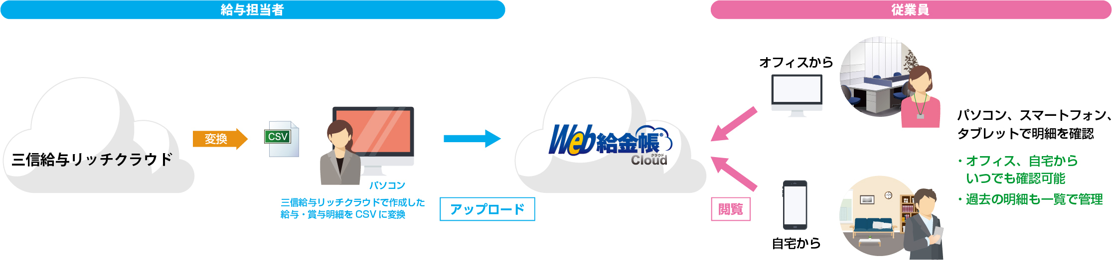 今回の連携により、「三信給与リッチクラウド」を使用している給与業務担当者はWeb上で給与明細を作成し全国の従業員へ一括配付できます。従来かかっていた紙の明細書作成・封入・郵送などの手間が解消され、作業効率化による働き方改革を実現します。また、従業員はパソコンやスマートフォンを使って、オフィスや自宅からいつでも安全に明細を閲覧できます。