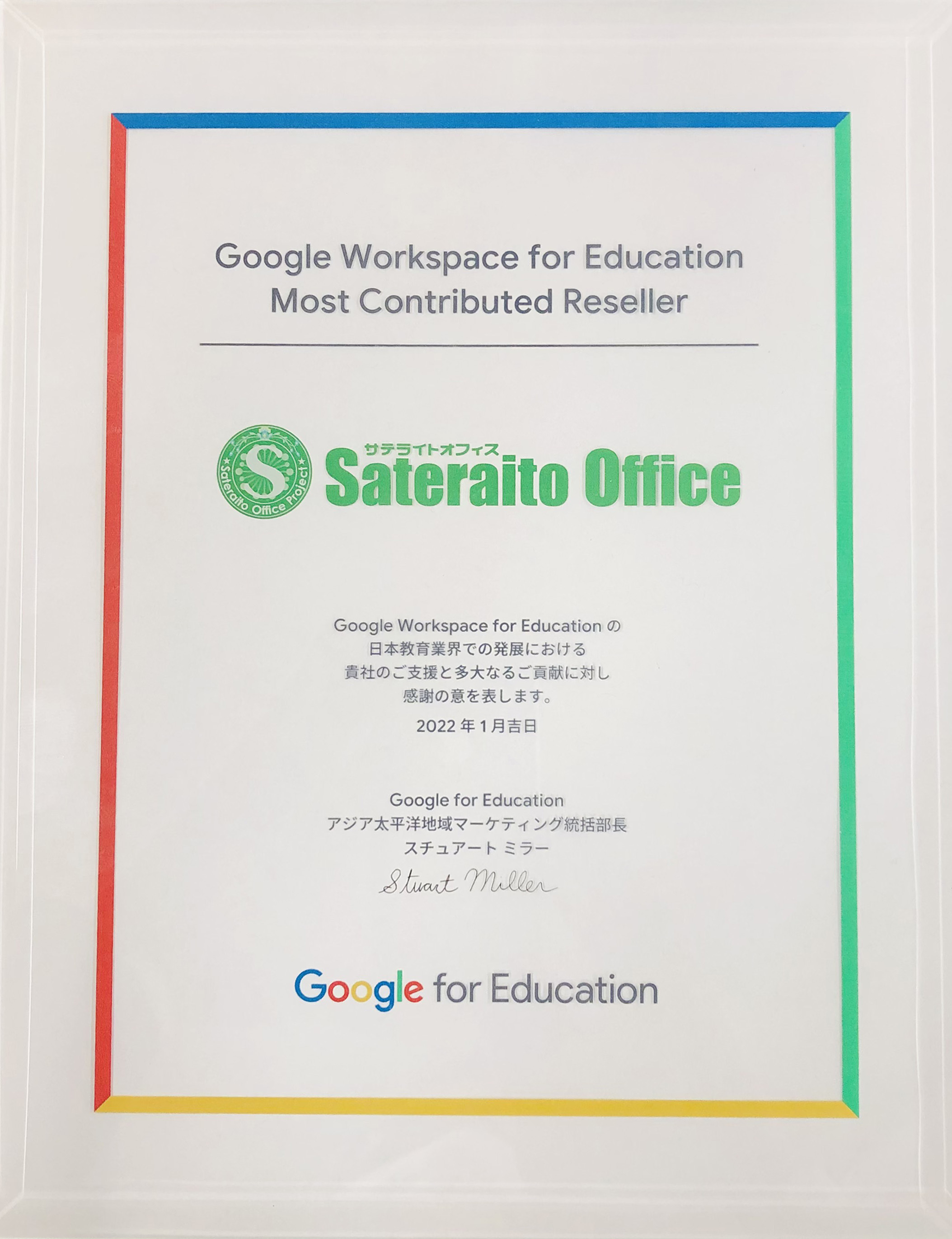 当社は2018年から、Googleの教育機関向けソリューション「Google for Education」の販売代理店として数多くの教育機関向けに、ChromebookやGoogle Workspace for Educationの導入支援サービス、さらにアドオンツールを提供してきました。今回、日本の文教分野におけるGoogle Workspace for Education の普及に当社が大きく貢献したとして、Google社から、数ある認定リセラーの中から、「最も貢献したリセラー」として認定されたものです。