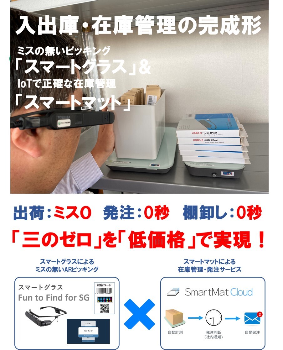 スマートグラスARデジタルピッキング「Fun to Find for SG」と「SmartMat Cloud」を組み合わせる事で、物流の主たる三つの業務「誤出荷・棚卸し・発注作業のゼロ」が可能となります。