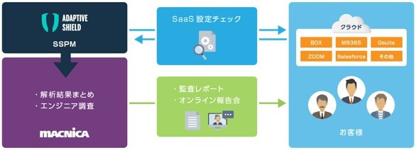 マクニカは、このような課題を解決するために、各SaaSのセキュリティ上の設定不備を調査して対策方法を報告する「SaaS設定監査レポートサービス」をリリースしました。本サービスは、SaaSの設定監査を行うためのSSPM専用ソリューションであるAdaptive Shieldを活用して、SaaSの設定をセキュリティスタンダードに基づき監査や診断します。さらに、マクニカのエンジニアの知見を活かしたレポートや報告会を提供します。