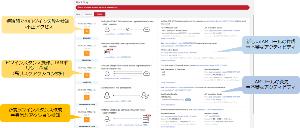 CSPM、CIEMはクラウドを正しい設定状態に導くことでリスクを最小化するための事前対策としては有用ですが、インシデントの兆候検知や事後対応に重きを置いたものではありません。パブリッククラウドにおいても、オンプレミス同様、インシデントの兆候をいち早く検知し、実際に内部への侵入といったインシデントが発生した際には、誰がどこで何を行ったかを把握し、迅速な攻撃への対処を行う必要があります。しかしながら、多くのCSPMベンダーやパブリッククラウドが提供するインシデント検知や脅威検知のソリューションは、単一のイベント検知のみを行うため、インシデント全体を把握するためには増大な時間を費やすことになります。