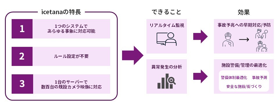 この度、マクニカが販売戦略と技術開発をさらに推進させる、AI画像解析技術を活用した異常検知ソフトウェア「icetana」は、カメラごとに画素の動きの傾向を常に学習し、通常と異なる映像のみを検知できます。監視員は、「icetana」によって検知された映像のみの確認に集中できるため、多数の監視カメラ映像から効率的に異常を発見し、迅速に対応することが可能となります。これにより、警備の品質向上や最適化を実現することができます。