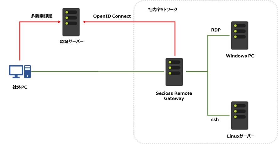 Secioss Remote Gatewayは社内にゲートウェイサーバーとして導入することで、VPNを使用せずに社外から社内のWindowsPC、Linuxサーバーにアクセスすることができ安全なリモートワークアクセスを実現可能です。