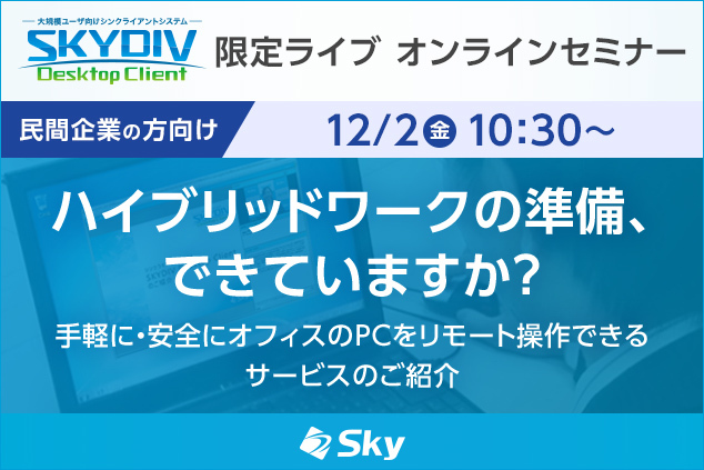 【12/2開催】企業の「ハイブリッドワーク」の実現をサポートする新サービスをご紹介するオンラインセミナーを開催いたします<SKYDIV Desktop Client>