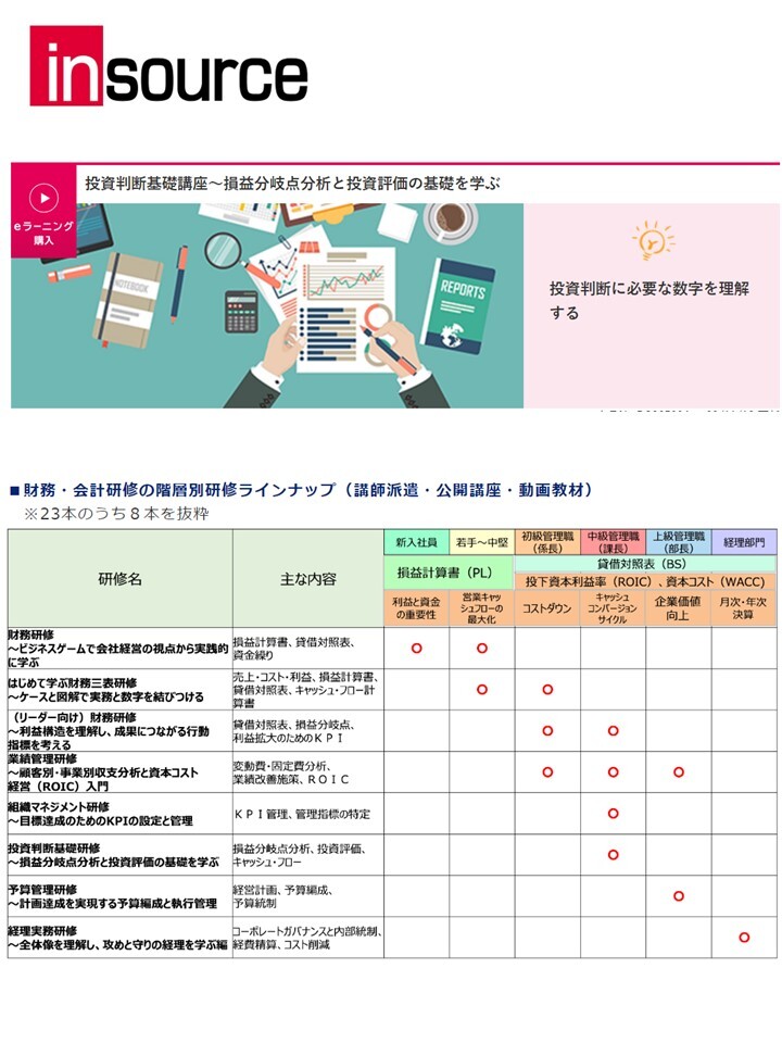 インソースでは、上記2つの新作コンテンツの他にも、すでに、「ROIC に焦点を当てた経営層向けの研修」や、「ビジネスゲームで会社経営の視点から実践的に学ぶ幅広い階層向けの研修」などのコンテンツがあり、全階層向けの会計・財務に関する研修体系をご用意しております。