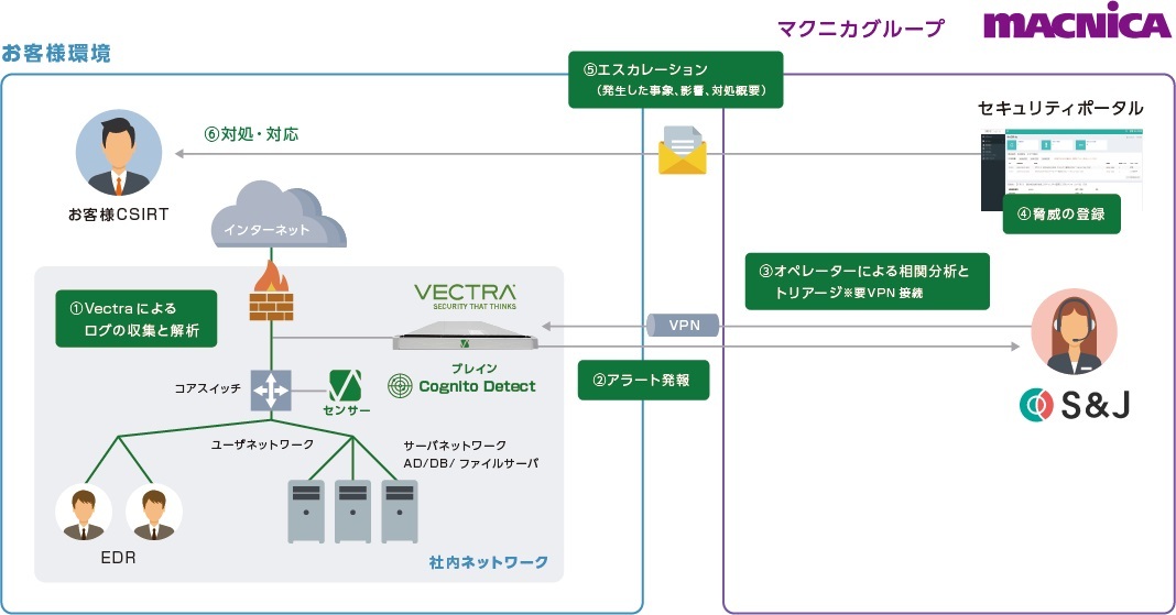 製品サポートから運用監視までを、Vectra AIの国内一次代理店であるマクニカが、関係会社であるS&J株式会社を含めたマクニカグループで一貫して支援することで、お客様のお問い合わせフローの煩雑化を防ぎ、包括的なサポートを実現します。