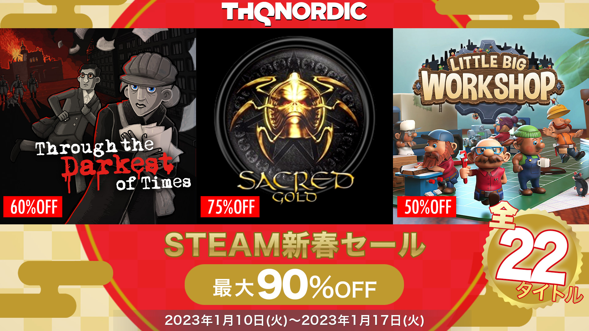THQ Nordicは、Steam®にて全22タイトルが、最大90%OFFでお買い求めいただける「THQ Nordic新春セール」を開催中です。