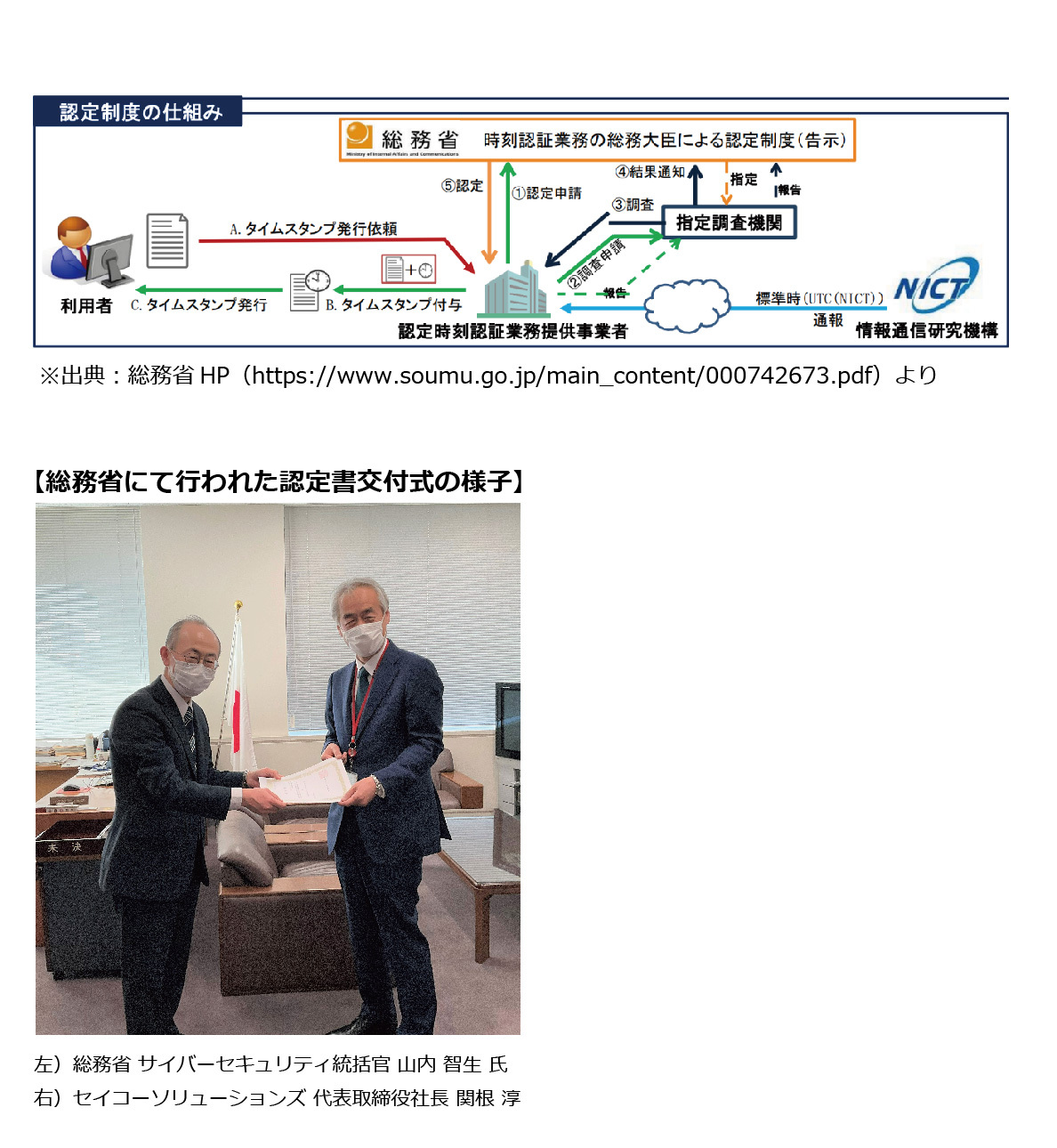 セイコーグループ株式会社(代表取締役会長 兼 グループCEO 兼 グループCCO:服部真二、本社:東京都中央区)のグループ会社である、セイコーソリューションズ株式会社(代表取締役社長:関根 淳、本社:千葉県千葉市、以下 セイコーソリューションズ)は、「時刻認証業務の認定に関する規程を定める件(令和3年総務省告示第146号)」に基づく、総務大臣による時刻認証業務(タイムスタンプサービス)認定を取得したことをお知らせします。