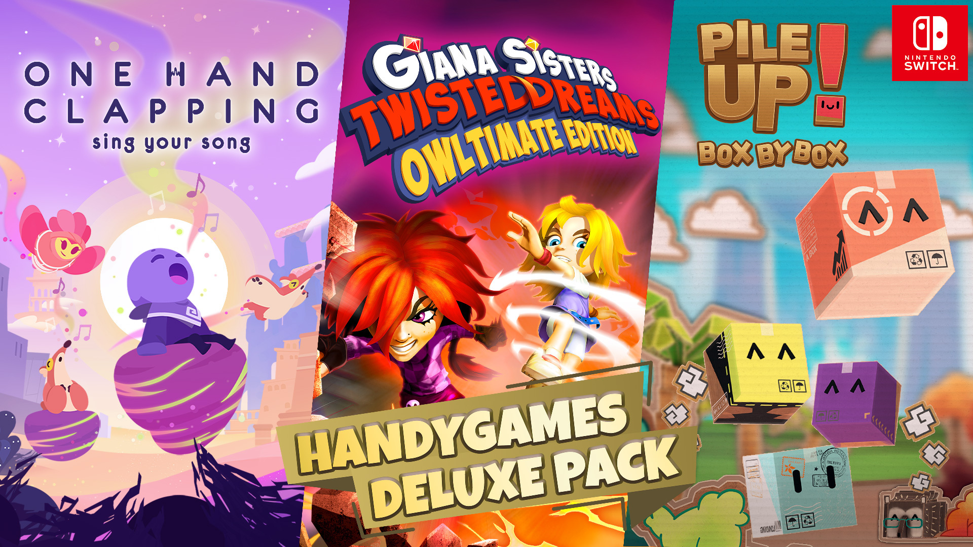 ハンディゲームズが贈るユニークなゲーム3本がセットになって登場!声で操作するパズルアクションゲーム『One Hand Clapping ワン ハンド クラッピング』、ギミック満載の世界を冒険する横スクロールアクション『ギアナシスターズ: ツイストドリームズ - オウルティメイト エディション』、かわいい段ボールつみあげパズル『パイルアップ!ボックス・バイ・ボックス』。どれも子どもから大人まで楽しめる。カラフルなステージでポップなキャラクターたちを操作して大冒険しよう!