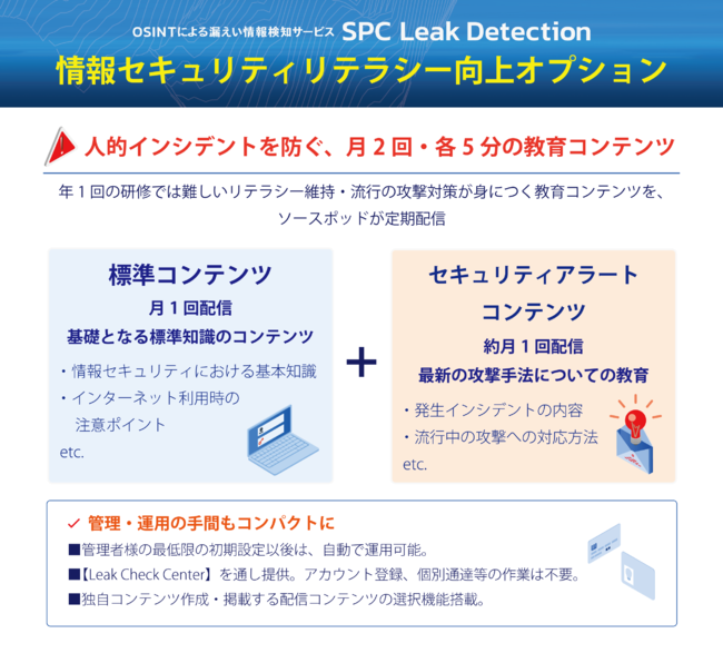 株式会社ソースポッド(本社:東京都新宿区、代表取締役社長:山本剛、以下 ソースポッド)は、月2回・各5分で、標準的な情報セキュリティ知識と、情勢に即した最新のセキュリティ脅威に関する知識・対策を身につけられる従業員向け教育コンテンツを、2023年5月より、OSINTによる漏洩アカウント自動検知サービス『SPC Leak Detection』の『情報セキュリティリテラシー向上オプション』として提供いたします。
