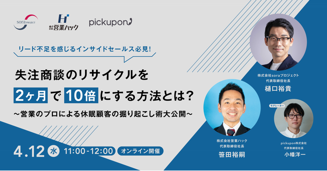 株式会社営業ハック(本社:東京都港区・代表:笹田裕嗣)と株式会社soraプロジェクト(本社:福岡県筑紫野市・代表:樋口裕貴)pickupon株式会社(本社:東京都港区・代表:小幡洋一)が共催ウェビナーを行います。日時は2023年4月12日(水)11:00~12:00、参加費は無料です。営業パーソンが必ず当たる壁である「受注数の低下」。これを避けるために役立つのが休眠顧客の掘り起こし。ただ意外と失注をそのままにしていたり、掘り起こしの仕方を間違えて成果に繋げられていない営業パーソンが多いのも事実です。そこでどのようにアプローチしていくことが大事なのか、営業のプロフェッショナルが解説していきます!
