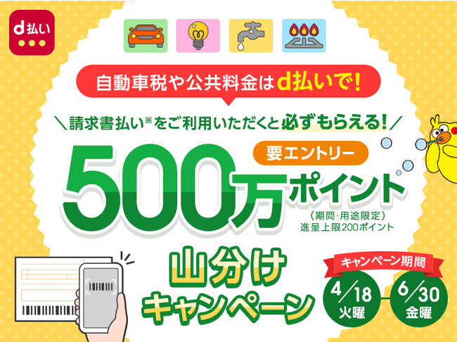 株式会社NTTドコモ(以下、ドコモ)は、「d払い」の請求書払いでお支払いいただいたお客さまを対象に、dポイント (期間・用途限定)500万ポイントを山分けして参加者全員に進呈する「d払いの請求書払いをご利用でdポイントが必ずもらえる!500万ポイント山分けキャンペーン!」(以下、本キャンペーン)を、2023年4月18日(火)から 2023年6月30日(金)まで開催します。