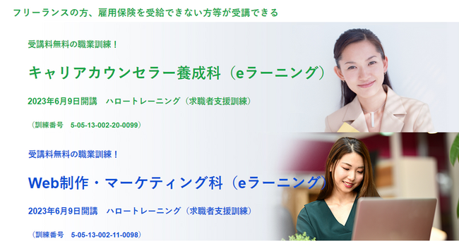 ハロートレーニング「キャリアカウンセラー養成科(eラーニング)B-36」(6月9日開講・4か月訓練)「Web制作・マーケティング科(eラーニング)B-32」募集概要