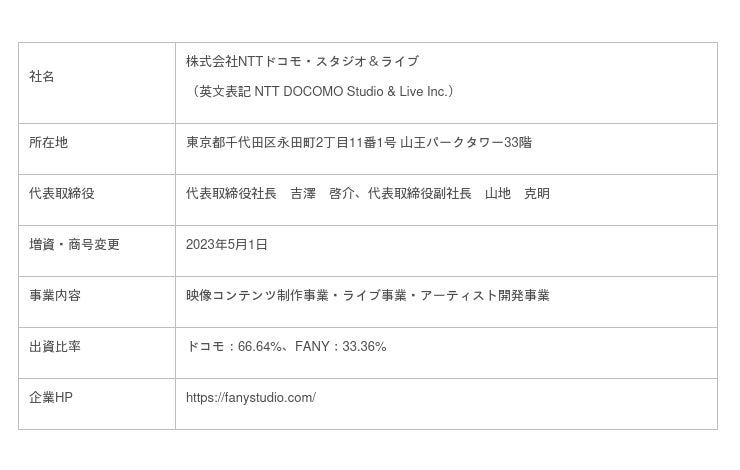 加えて、本業務提携に伴い、FANY Studioが第三者割当の方法により発行する株式をドコモが引き受けることとしました。FANY Studioは2023年5月1日(月)から、「株式会社NTTドコモ・スタジオ&ライブ」(以下、ドコモ・スタジオ&ライブ)として、映像コンテンツ制作事業、音楽をはじめとするライブ事業、アーティスト開発事業の3事業を開始いたします。