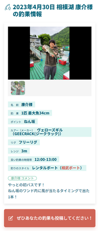 まとまった釣果情報をバス釣りに特化した項目で確認できるので、釣行前のタックル選びの参考になります。