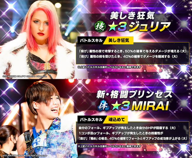 株式会社ブシロード(本社:東京都中野区、代表取締役社長:木谷高明)は、株式会社ドリコム(本社:東京都品川区、代表取締役社長:内藤 裕紀)と共同開発しているスマートフォンゲームアプリ『新日本プロレスSTRONG SPIRITS』(以下、新日SS)にて、2023年5月17日(水)メンテナンス終了後より、新規育成選手として★3ジュリアと★3MIRAIがSTARDOM限定の各スカウトにて初登場します。また、初登場を記念して全ユーザー様にダイヤ1500個配布しました。