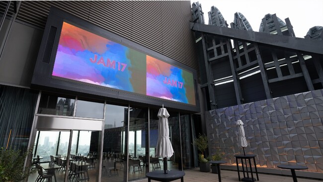 17階のダイニング&バー「JAM17 DINING & BAR(ジャムセブンティーン ダイニングアンドバー)」では、ダイニングには86インチ液晶ディスプレイを設置し、開放感あふれるルーフトップテラスに屋外ビジョン1基、SPACE WESTのパーティールームには屋内ビジョン1基、SPACE EASTにはプロジェクター1基設置しています。