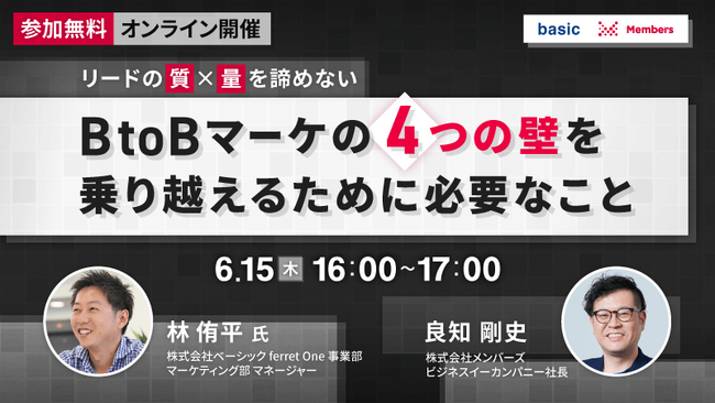 本セミナーでは、メンバーズ社のBtoB/法人営業におけるデジタル化支援事業を行う社内カンパニーで社長を務める良知氏が「“4つの壁”を乗り越える内製型のBtoBマーケティングの実現方法」について、BtoBマーケティング領域のプロである『ferret One』においてマーケティングマネージャーを務める当社の林が「『ferret One』を活用して内製型のBtoBマーケティング組織を加速させていく秘訣」について解説いたします。