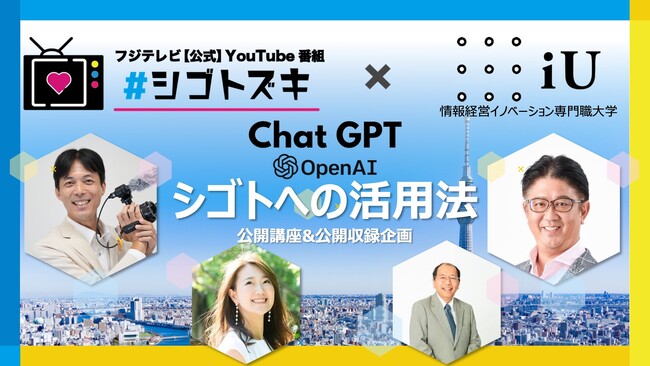 フジテレビが運営する公式YouTube番組『#シゴトズキ~リーダーたちの思考法【入門編】』(以下:#シゴトズキ、 (リンク ») )は、情報経営イノベーション専門職大学(東京都墨田区、以下:iU)とコラボレーションし、5月30日(火)18時から「ChatGPT」をテーマにした公開収録講座を開催します。当日はChatGPTの仕組みやビジネス分野での活用についての講演とあわせて、iUの学生によるChatGPT活用のアイデアプレゼン大会を実施します。