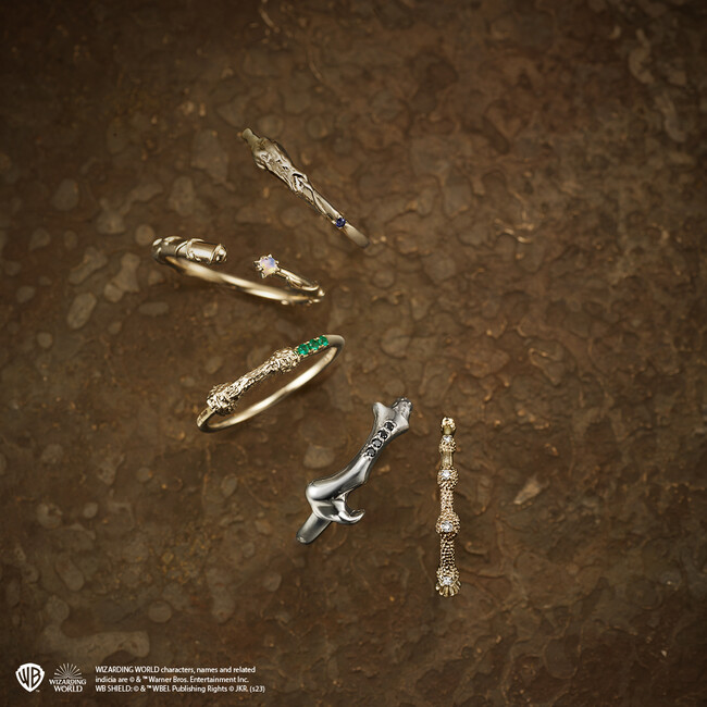 ハリー、ロン、ハーマイオニー、ダンブルドア、ヴォルデモート卿がそれぞれ手にする特徴的な杖のリング。ハリーの杖には目の色をイメージしてエメラルドをセッティングしたりなど、ファンにはたまらない細かいこだわりもポイント。