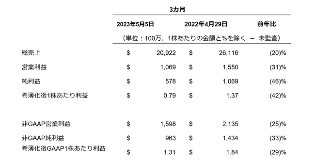 デル・テクノロジーズは、2024会計年度(2023年2月~2024年1月)の第1四半期(2023年2月~2023年4月)の業績を発表しました。第1四半期の売上高は、前年同期比20%減の209億ドル、営業利益は前年同期比31%減の11億ドル、非GAAPベースの営業利益は同25%減の16億ドルでした。希薄化後1株あたり利益は、前年同期比42%減の0.79ドル、非GAAPベースの希薄化後1株あたり利益は、前年同期比29%減の1.31ドルでした。営業キャッシュフローは18億ドルでした。