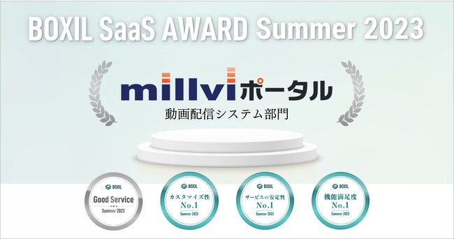 今回の「BOXIL SaaS AWARD Summer 2023」は、2022年4月1日から2023年3月31日までの1年間で新たに投稿されたクチコミ約16,000件を審査対象としており、『millviポータル』は動画配信システム部門での「Good Service」に加え「カスタマイズ性No.1」「機能満足度No.1」「サービスの安定性No.1」の3つのNo.1を受賞しました。