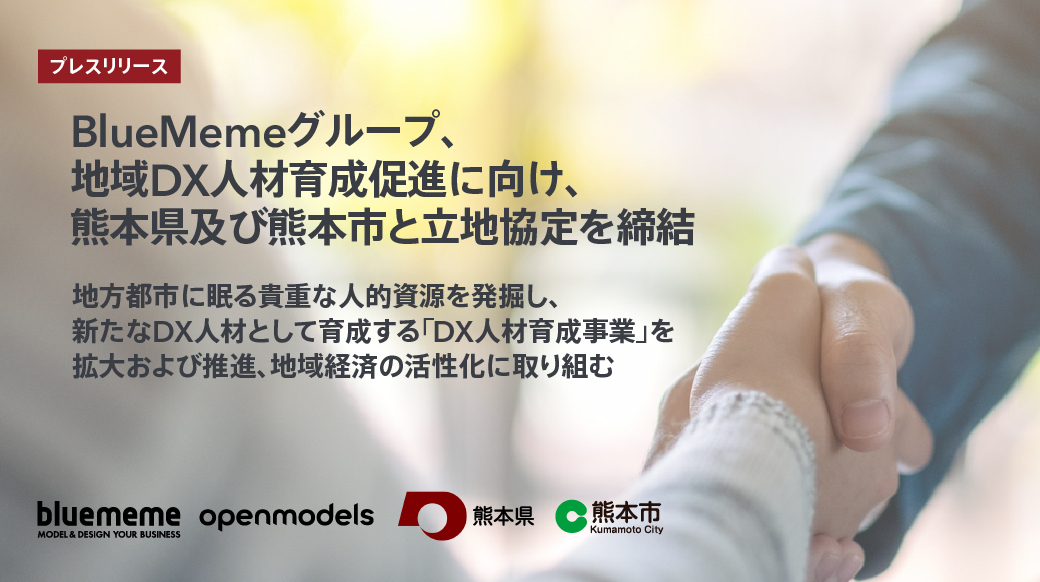 BlueMemeグループは、国内外の4拠点(東京本社、福岡、沖縄、オランダ ロッテルダム)に事業拠点を構えており、熊本は5つ目の拠点となります。熊本オフィスの開設により、シチズンデベロッパー(ソフトウェア開発者としての市民)を増やし、システムの受託開発や内製化支援を通して、新たなDX人材の育成を進めて参ります。地方都市での更なる就労機会の創出や地場企業とのコラボレーションなどを通じて、DXを一層力強く推進していきます。