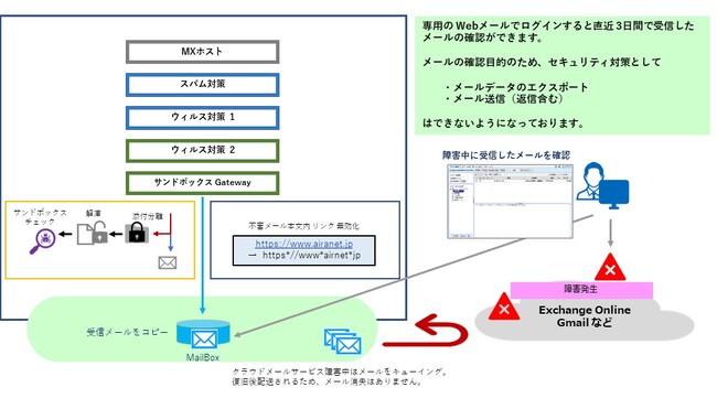 受信メールのセキュリティ強化に加え、ご利用のメールサービス(Exchange Online や Gmail など)に障害が発生し、受信メールの確認ができない場合でも「セキュリティプラス」を通過したメールのコピーを一定期間保存し、メール本文・添付ファイルの確認ができる「キープメール」機能をオプションとしてご利用いただけます。