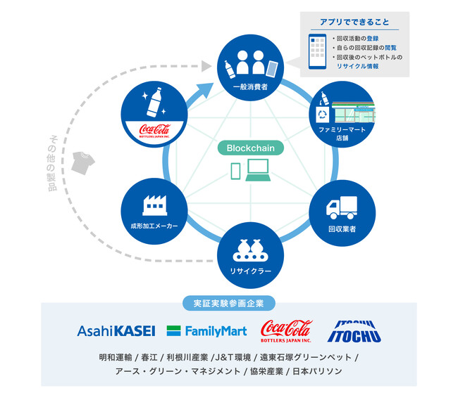 旭化成株式会社(本社:東京都千代田区、代表取締役社長:工藤 幸四郎、以下「旭化成」)、株式会社ファミリーマート(本社:東京都港区、代表取締役社長:細見 研介、以下「ファミリーマート」)、伊藤忠商事株式会社(本社:東京都港区、代表取締役社長COO:石井 敬太、以下「伊藤忠商事」)および伊藤忠プラスチックス株式会社(本社:東京都千代田区、代表取締役社長:林 英範、以下「CIPS」)およびコカ・コーラ ボトラーズジャパン株式会社(本社:東京都港区、代表取締役社長 最高経営責任者:カリン・ドラガン、以下「コカ・コーラ ボトラーズジャパン」)は、資源循環社会の実現に向けたデジタルプラットフォーム構築プロジェクト「BLUE Plastics(ブルー・プラスチックス)」の取り組みの一環として、使用済みペットボトルを回収箱に投函したあと、リサイクル素材や製品に加工されるまでを、スマートフォンのWebアプリでトレース(追跡)できるサービスの実証実験を、2023年6月15日(木)から、東京都内のファミリーマート3店舗で開始します。実証実験は8月31日(木)までの期間を予定しており、アプリの稼働状況や、消費者の行動変容、再生プラスチックの利用促進に与える影響などを検証します。