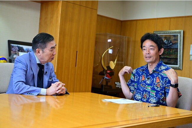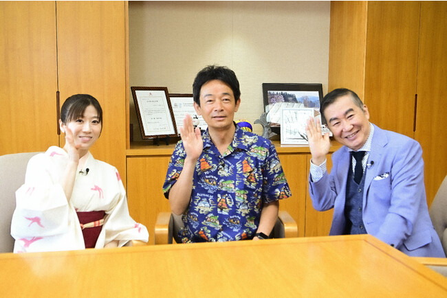 2人は“映える城下町”として注目を集めている犬山城の城下町の散策を楽しみ、犬山市役所へ。出迎えたのは、今回の対談相手、原欣伸(はらよしのぶ)市長。アロハシャツ姿の原市長に「犬山市長というよりも、湘南の市長みたい」と文枝が言うと、「よくぞツッコんでくださいました」と原市長。犬山をモチーフにした犬山アロハシャツは、「ふるさと納税」の返礼品も申請中だそうで、「ぜひご興味のある方は犬山市にふるさと納税をよろしくお願いします」とさっそくアピールします。