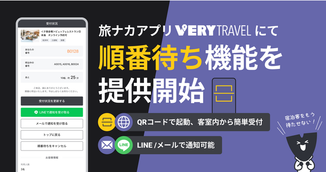 宿泊施設では、フロントや朝食、夕食会場など特定の時間帯において利用が集中し、行列ができてしまう場面があります。この行列を解消し、ゲストを滞在中に待たせないことを実現するため、観光分野のDXを推進する株式会社アクティバリューズ(東京都渋谷区、代表取締役社長:陳適)は、ホテル・旅館向けの旅ナカアプリ「VERY(べりー)」に順番待ち機能を追加致しました。宿泊施設様が「VERY」のすべての機能を無償でご利用いただけます。