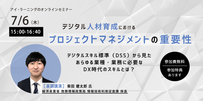 株式会社アイ・ラーニング(本社:東京都中央区、社長:吉田 融正)は、7月6日(木)に無料セミナー 『デジタル人材育成におけるプロジェクトマネジメントの重要性 ~デジタルスキル標準(DSS)から見たあらゆる業種・業務に必要なDX時代のスキルとは?』 をオンラインにて開催いたします。