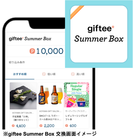 この度「シーズナルBox」の一つとして、2023年6月20日(火)より販売を開始する「giftee Summer Box」は、ビールの飲み比べセットや、夏の風物詩のそうめん、お好きなフレーバーが選べるアイスクリームといった、暑い日に嬉しい涼やかなギフトを揃えております。季節に合ったラインナップで、最大65ブランド、約330商品のギフトの中から、贈られた人が好きな商品を選び、受け取ったギフトポイントと交換できます。500~10,000ポイントの6券種をご用意しており、受け取ったギフトポイントの範囲内で、1つの商品または複数の商品を組み合わせて交換することができます。お世話になった方へ日頃の感謝をカジュアルに伝えるコミュニケーションの手段として、ぜひ「giftee Summer Box」をご活用ください。