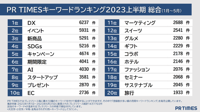 「PR TIMES」ではプレスリリース発表の際に、発表企業がプレスリリース内容に関係するキーワードを最大10個登録することができます。2023年1~5月に発表された総計14万1703件のプレスリリースのキーワード登録総数は23万1220種(延べ111万6472個)に上りました。総合ランキングでは2023年上半期の企業活動の潮流を、そして月別ランキング推移からは企業動向の変遷と流行の兆しをキーワードを通して分析しています。